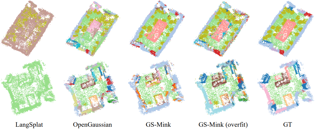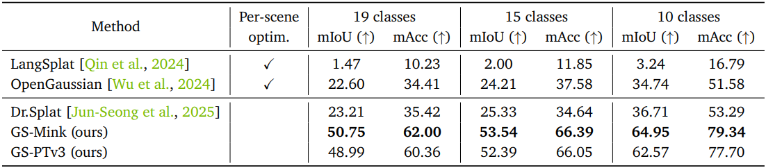본 논문에서는 ScanNet 데이터셋과 LeRF-OVS 데이터셋 두 가지를 사용하여 open-vocabulary 3D semantic segmentation task에서 GS-Net의 성능을 검증하였다. 기존 연구들을 따라, CLIP 비전 인코더의 feature 벡터를 distillation 타겟으로 사용한다. 먼저 Grounded-SAM2를 사용하여 마스트 \(\{\textbf{m}\}\)을 추출하고, 해당 마스크에서 CLIP 임베딩 $\textbf{f}^\textrm{CLIP}$을 추출한다.