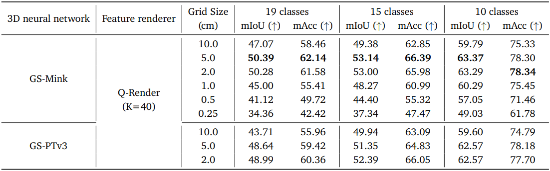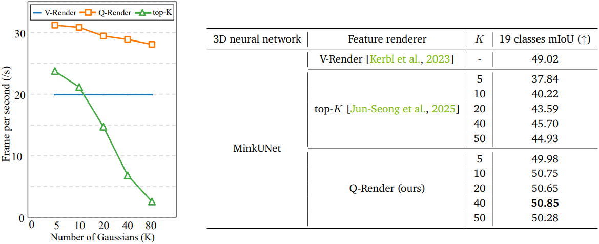 또한, 3D 신경망의 inductive bias는 공간적으로 부드러운 Gaussian feature 예측을 촉진한다. 따라서 광선을 따라 dense한 샘플링을 렌더링하는 것은 불필요해진다. Q-Render는 렌더링 및 backward pass 모두에서 계산 오버헤드를 크게 줄이면서도 높은 정확도의 feature 매핑을 수행하기에 충분하다.