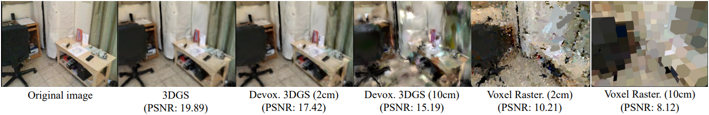 다음은 Gaussian을 de-voxelization한 결과와 de-voxelization 없이 렌더링한 결과를 비교한 예시이다.