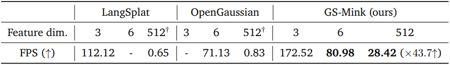 기존의 볼륨 렌더링 알고리즘은 출력에 대한 실제 기여도와 관계없이 광선과 교차하는 모든 Gaussian을 샘플링한다. RGB 렌더링의 경우 이러한 오버헤드는 감당할 수 있지만, 512차원 CLIP feature와 같은 고차원 임베딩의 경우 계산량이 과중해진다. 이 문제를 해결하기 위해 여러 논문에서 512차원 CLIP feature의 차원을 3차원 또는 6차원이나 codebook으로 압축하는 방법을 제시했다. 이러한 전략은 효과적이지만 근본적인 해결책은 아니며, 고차원 feature에 저장된 원래 정보를 손실할 가능성이 있다. 또한, 최적화된 3D Gaussian은 장면별 최적화 방식으로 인해 노이즈가 많거나 local minima를 가질 수 있다. 따라서 이러한 3D Gaussian 위에 고차원 feature 벡터를 적절하게 임베딩하는 것은 어려운 과제이다.