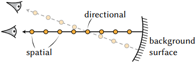 \[\begin{equation} \mathcal{L}_\textrm{total} = \sum_{k=1}^n \mathcal{L}_\textrm{ray} (\textbf{r}_k) \end{equation}\]기존의 표면 최적화는 표면 자체에만 gradient를 전파하는 반면, \(\alpha_\textbf{p}\)와 \(L_\textbf{p}\)를 사용하면 관측된 3D 공간 전체를 포괄한다. 여러 방향에서 바라본 위치의 경우, loss는 일반적으로 방향에 따라 달라진다.