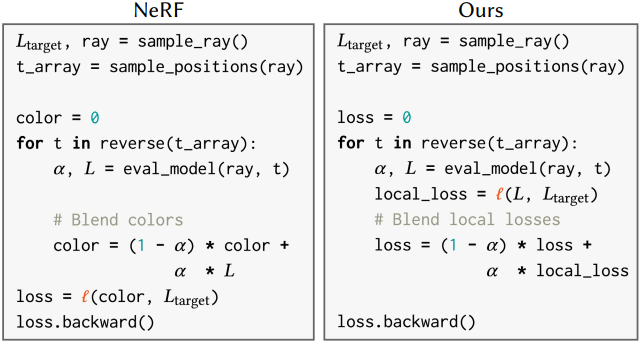 Loss function의 구현은 NeRF와 같은 표준 volumetric 재구성 방법의 색상 혼합 구조와 유사하게 구성될 수 있다. 따라서 기존 코드베이스에서 구현하기가 매우 간단하며, 이는 아래의 pseudocode 비교에서 확인할 수 있다.