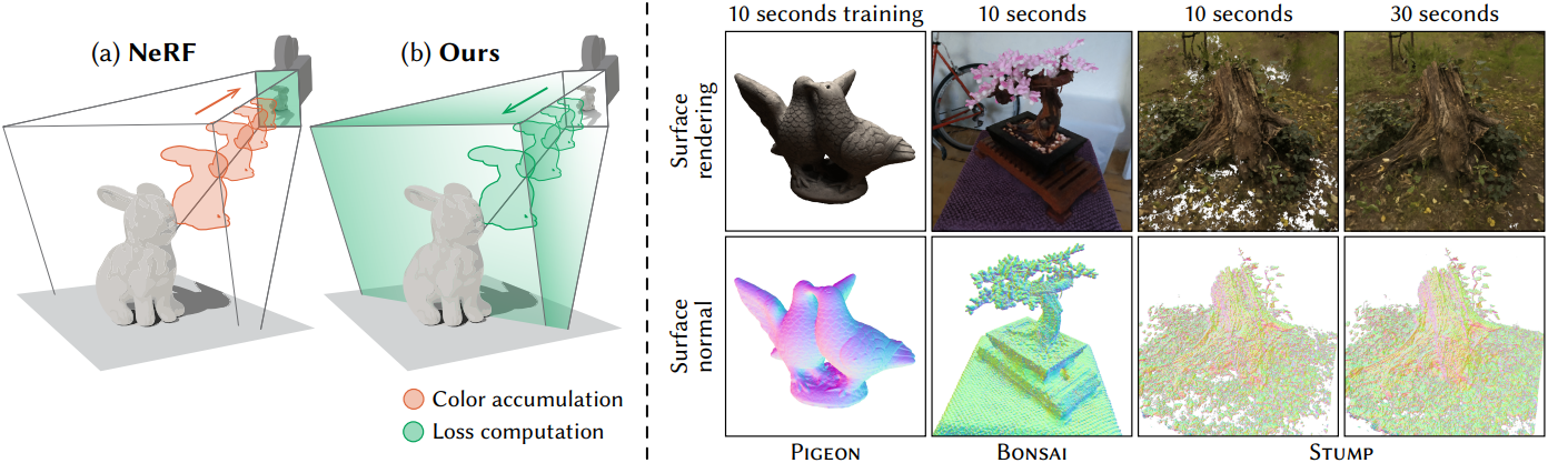본 논문에서는 volumetric 기법의 robustness와 수렴 속도를 유지하면서 표면을 최적화하는 간단하고 직접적인 접근법을 모색하였다. 제안하는 방법은 표면 분포를 최적화하는 간단하면서도 강력한 아이디어를 기반으로 한다. 구체적으로, 학습 사진을 장면에 projection하여 최종 light field와 표면 분포에서 발생하는 emission 사이의 차이를 최소화하는 것을 제안하였다.