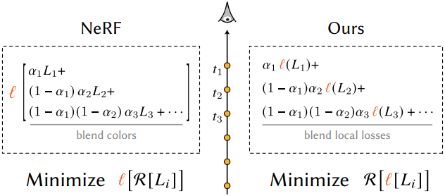 결과적으로 발생하는 radiance field loss는 광선을 따라 있는 각 점을 표면 후보로 간주하고, 해당 광선의 픽셀 색상과 일치하도록 개별적으로 최적화하여 표면에 원하는 분포를 생성한다. 한 가지 이점은 광선을 따라 있는 점들이 독립적인 gradient를 받아 색상이나 밀도가 한 점에서는 증가하고 다른 점에서는 감소할 수 있다는 것이다. 이는 loss 계산 전에 광선을 따라 색상을 통합하는 volumetric 접근법과 현저히 다르다. 즉, volumetric 재구성을 사용하면 광선을 따라 있는 모든 점의 통합 색상이 너무 어둡거나 밝으면 동일한 부호의 gradient를 받아 상관 관계가 있는 조정이 이루어진다.
