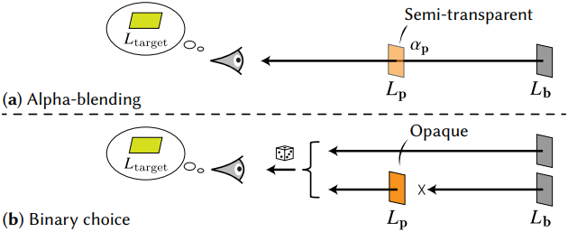 Non-local perturbation의 개념을 설명하기 위해 먼저 광선을 따라 하나의 후보 표면 패치가 존재하는 경우를 살펴보자. 위 그림은 이러한 셋업을 보여준다다. 여기서 색상이 \(L_\textbf{p}\)이고 occupancy가 \(\alpha_\textbf{p}\)인 위치 $\textbf{p}$의 후보 패치가 색상이 \(L_\textbf{b}\)인 배경보다 앞에 있다. \(L_\textbf{p}\)가 주어졌고 색상 값 \(L_\textbf{p}\)와 \(L_\textbf{b}\)는 고정되어 있다고 가정한다.