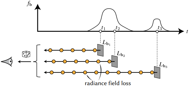 분포 \(f_\textbf{b}\)의 설계는 유연하다. 한 가지 간단한 접근 방식은 occupancy가 높은 영역에서 샘플링을 우선시하는 것이다. 이러한 영역은 표면과 일치할 가능성이 더 높기 때문이다. 광선 순회 중에 occupancy를 기반으로 위치를 배경 표면으로 사용할지 여부를 확률적으로 결정한다. 이러한 순차적인 결정 과정은 free-flight distance 개념을 반영하여 free-flight 배경 분포를 형성한다.