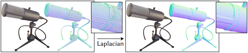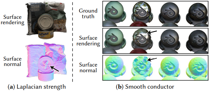다음은 충분한 뷰에 대하여 학습된 간단한 장면의 예시이다. 학습 중에 Laplacian regularizer를 적용하면 표면이 부드러워져 최종 geometry가 더 정확해진다.
