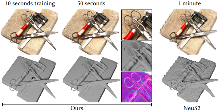 다음은 메쉬 추출 결과를 NeuS2와 비교한 결과이다.
