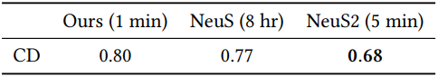 제안된 radiance field loss는 volumetric 재구성 방법과 매우 유사한 방정식을 도출한다. 실질적으로 이는 본 논문의 방법이 기존 volumetric 프레임워크에 쉽게 통합될 수 있음을 의미한다. 또한, 표면을 추출하기 위해 추가적인 휴리스틱을 사용하지 않고도 기존 연구의 많은 장점을 그대로 활용할 수 있음을 의미한다. Volumetric 기반 방식보다 평균 0.1dB 낮은 PSNR을 생성하면서도 거의 동일한 속도로 실행된다.