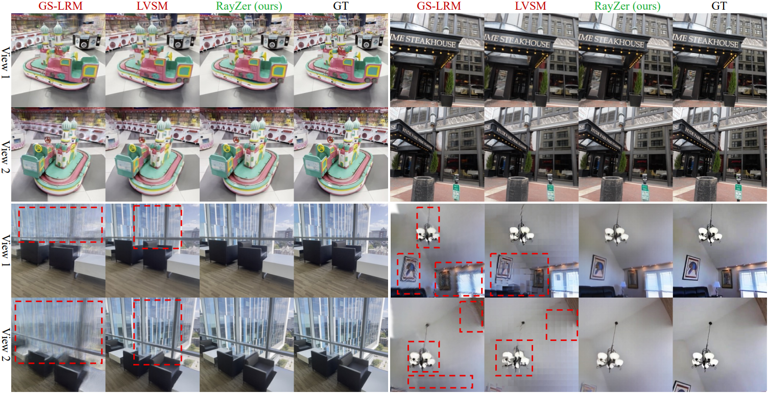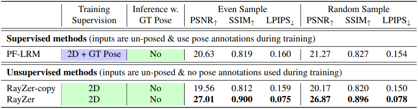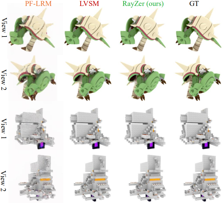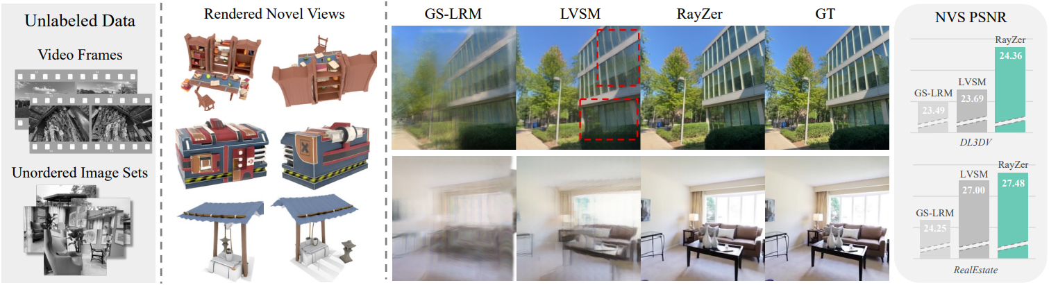본 논문에서는 self-supervision으로 학습되고 새로운 3D awareness를 보여주는 대규모 멀티뷰 3D 모델인 RayZer를 소개한다. RayZer의 입력은 연속적인 동영상 프레임 또는 순서가 지정되지 않은 멀티뷰 캡처에서 샘플링된 포즈 및 calibration 정보가 없는 멀티뷰 이미지이다. RayZer는 먼저 카메라 파라미터를 복구하고, 장면 표현을 재구성한 다음, 새로운 시점을 렌더링한다. Self-supervised learning의 핵심 아이디어는 렌더링에 GT 포즈를 사용하는 대신, RayZer 자체가 예측한 카메라 포즈를 사용하여 photometric 정보를 제공하는 시점을 렌더링하는 것이다. 따라서 RayZer는 3D geometry나 카메라 포즈에 대한 정보 없이 학습될 수 있다. Inference 과정는 장면별 최적화 없이 feed-forward 방식으로 카메라 및 장면 표현을 예측한다.