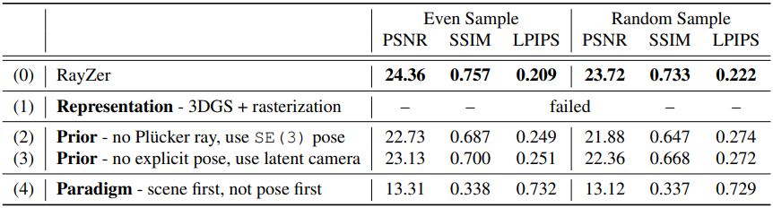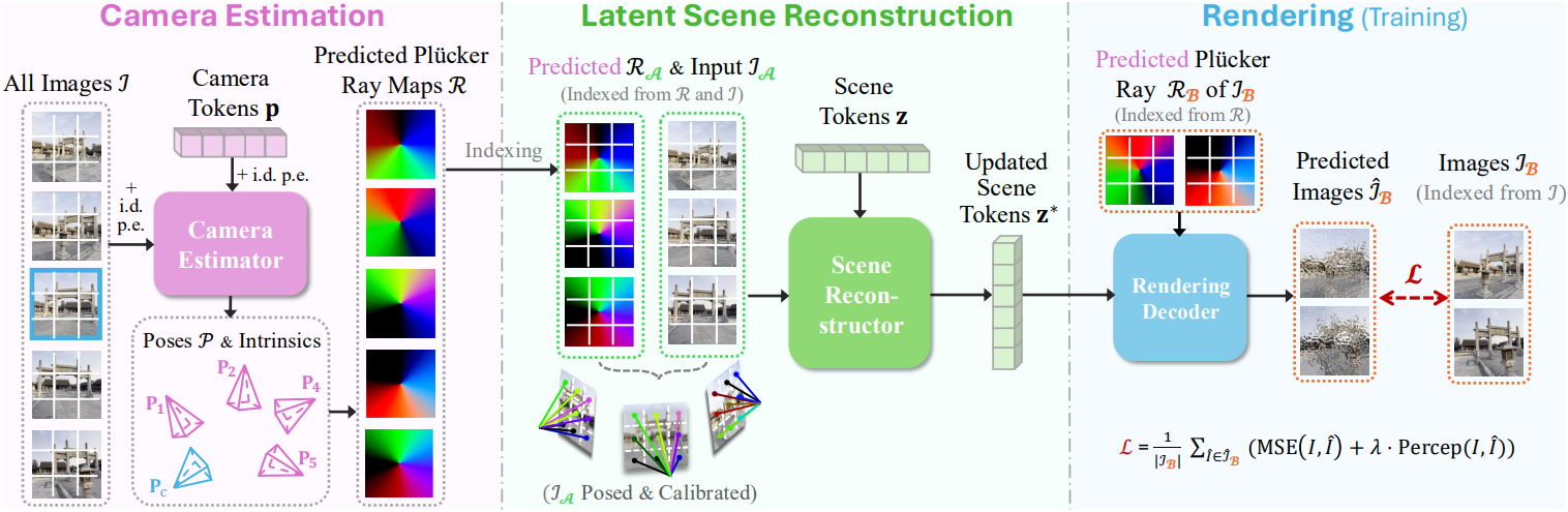 \[\begin{equation} \mathcal{I} = \{I_i \in \mathbb{R}^{H \times W \times 3} \, \vert \, i = 1, \ldots, K\} \end{equation}\]이다. 출력은 입력의 parametrization, 즉 카메라 intrinsics, 시점별 카메라 포즈, 장면 표현으로, novel view synthesis (NVS)를 가능하게 한다. 저자들은 이러한 표현을 예측하기 위해 RayZer 모델을 구축하고 self-supervised learning 방식으로 학습시켰다. 즉, 학습 과정에서 3D supervision, 즉 3D geometry나 GT 카메라 포즈를 사용하지 않는다.