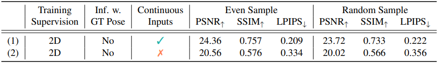 다음은 입력 뷰에 대해 RayZer가 예측한 포즈를 interpolation한 후 렌더링한 결과이다. (interpolation 계수는 GT 포즈를 기준으로 계산)