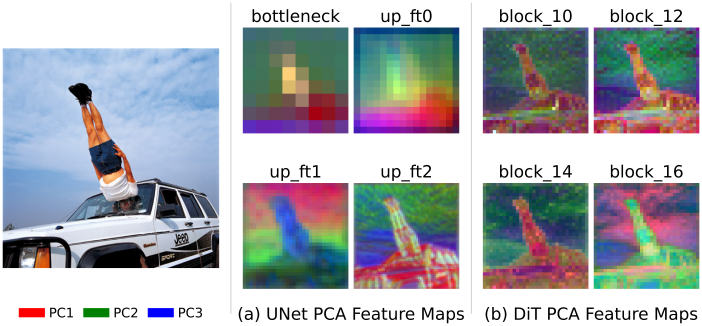 다음은 SD 1.5와 DiT의 top-3 PCA component를 비교한 예시이다. SD 1.5의 feature는 다양한 세분성으로 공간적인 정보를 포착한다.