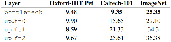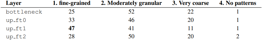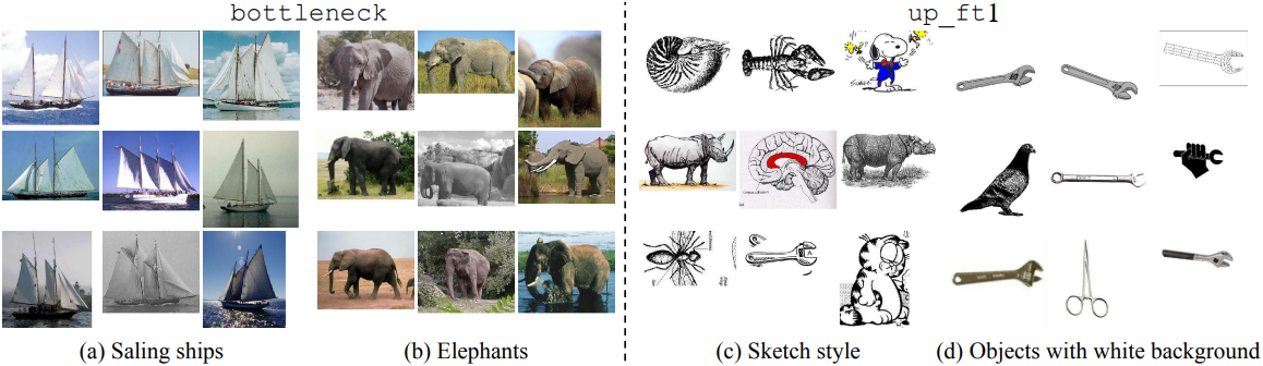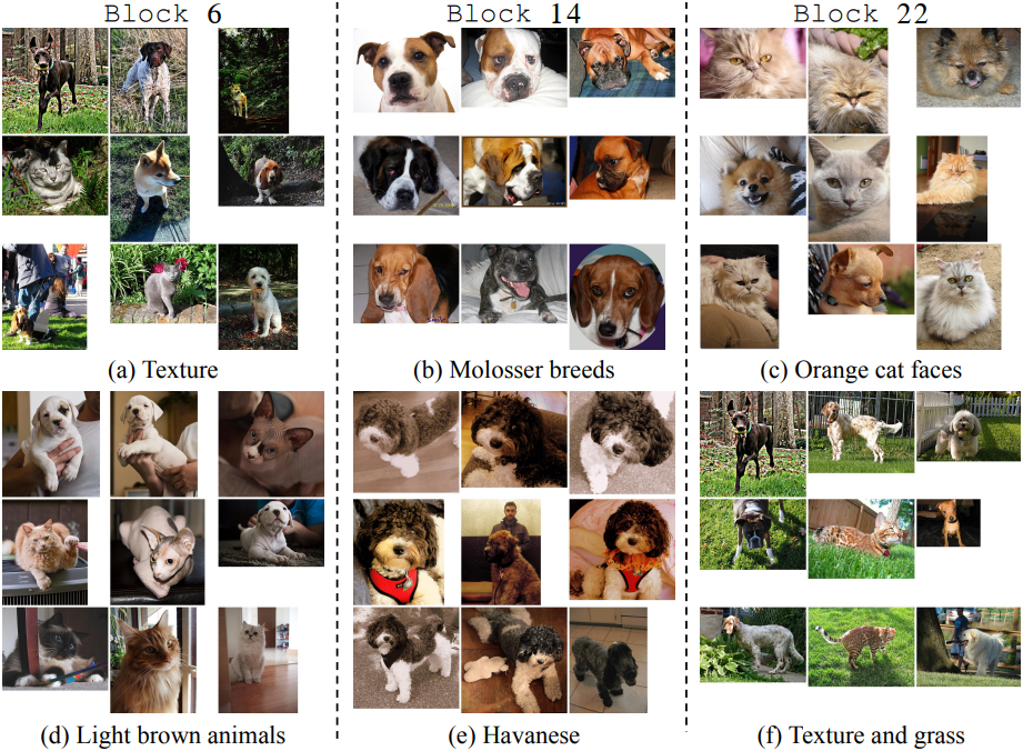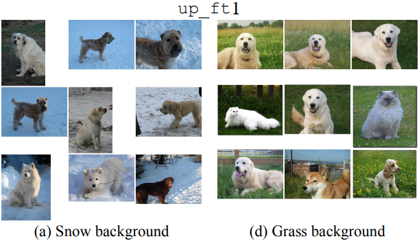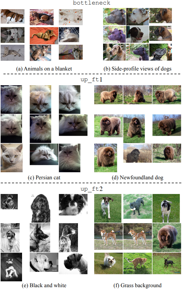 다음은 Oxford-IIIT Pet 데이터셋에 대하여 k-SAE를 시각화한 것이다. bottleneck은 배경에 대해 유사하게 배치된 매우 coarse한 물체 패턴을 분리한다. up_ft1의 경우, 명확한 클래스별 feature가 관찰되어 품종을 분리하는 데 도움이 된다. up_ft2는 잔디와 같은 더욱 포괄적인 텍스처 정보를 포착한다.