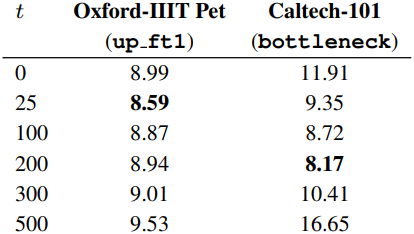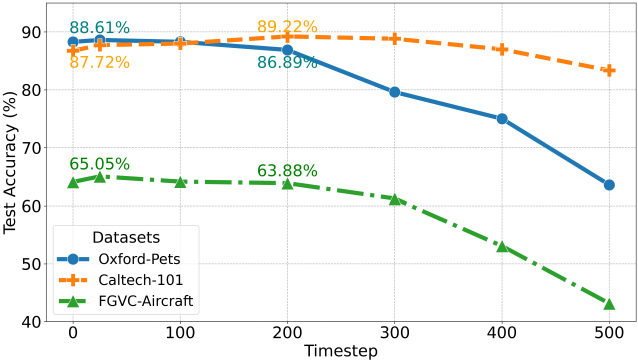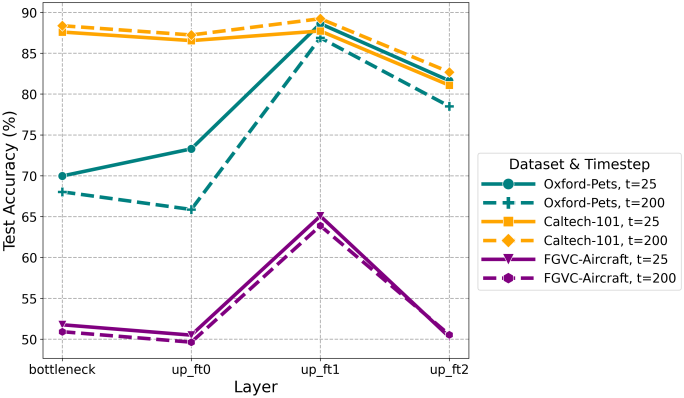 다음은 timestep에 따른 Diff-C의 classification 정확도를 비교한 결과이다 (layer는 up_ft1). Fine-grained 데이터셋인 Oxford-IIIT Pet, FGVC-Aircraft의 경우 초기 timestep의 정확도가 높았고, coarse-grained 데이터셋인 Caltech-101의 경우 중간 timestep의 정확도가 높았다.