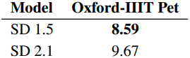 다음은 Stable Diffusion 버전에 따른 \(\sigma_\textrm{label}\)을 Oxford-IIIT Pet에서 비교한 결과이다. SD 1.5의 feature가 SD 2.1보다 물체 중심의 정보를 더 잘 포착하는 것을 알 수 있다.