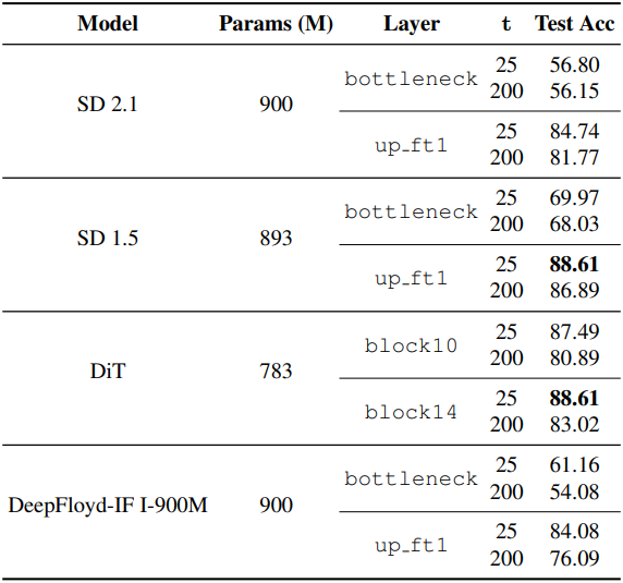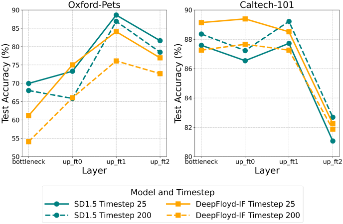 다음은 timestep에 따른 Diff-C의 classification 정확도를 비교한 결과이다 (layer는 up_ft1). Fine-grained 데이터셋인 Oxford-IIIT Pet, FGVC-Aircraft의 경우 초기 timestep의 정확도가 높았고, coarse-grained 데이터셋인 Caltech-101의 경우 중간 timestep의 정확도가 높았다.