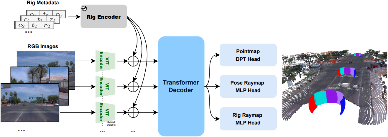본 논문은 멀티뷰 3D 재구성 및 포즈 추정을 위한 transformer 기반 모델인 Rig3R을 소개한다. Rig3R은 리그 메타데이터가 있는 경우 이를 활용하고, 없는 경우 리그 구조를 추론하도록 학습되었다. Rig3R은 한 번의 forward pass에서 각 이미지에 대한 dense pointmap과 raymap을 예측한다. Raymap은 카메라의 intrinsic 및 extrinsic 정보를 공간적으로 인코딩하며, 하늘이나 동적 픽셀과 같이 모호한 영역에서도 closed form으로 복원할 수 있다. 이러한 유연성을 지원하기 위해 Rig3R은 메타데이터 임베딩과 dropout 학습을 결합하고, 메타데이터를 사용할 수 없는 경우 이미지 콘텐츠에서 리그 구조를 직접 추론하는 전용 리그 예측 head를 포함한다.