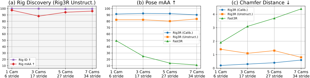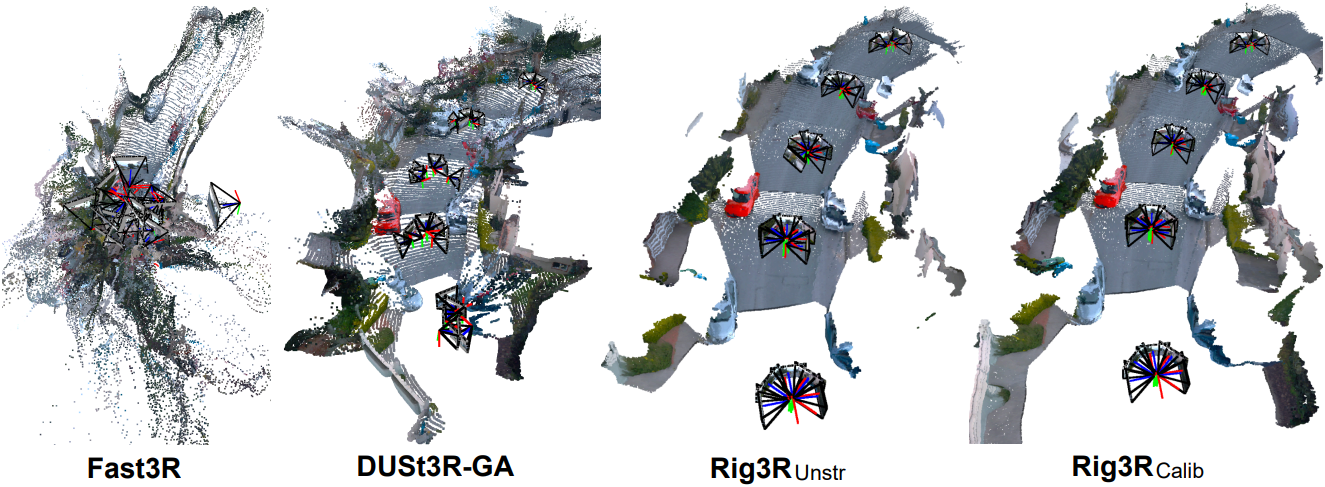 DUSt3R와 같은 최근 방법들은 멀티뷰 3D 재구성에서 인상적인 성능을 보여주었으며, 많은 후속 방법들이 이를 single-pass inference로 확장했다. 그러나 이러한 방법들은 이미지를 비정형화된 집합으로 취급한다는 한계가 있다. 이는 실제 응용 분야에서 흔히 나타나는 중요한 구조적 prior, 즉 이미지는 고정된 상대적 구성을 가진 동기화된 멀티 카메라 리그를 사용하여 촬영되는 경우가 많다는 점을 간과한다. 카메라 ID, 타임스탬프, 상대적 포즈와 같은 리그 메타데이터는 특히 시야 중첩이 제한될 때 귀중한 단서를 제공할 수 있다. 기존 파이프라인은 이러한 구조를 활용할 수 있지만, feedforward 모델은 현재 이 구조를 활용하지 않고 있다.
