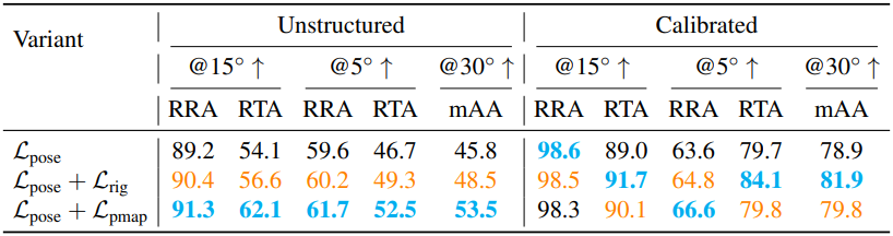 다음은 멀티뷰 카메라 포즈 추정에 대한 성능 비교 결과이다.