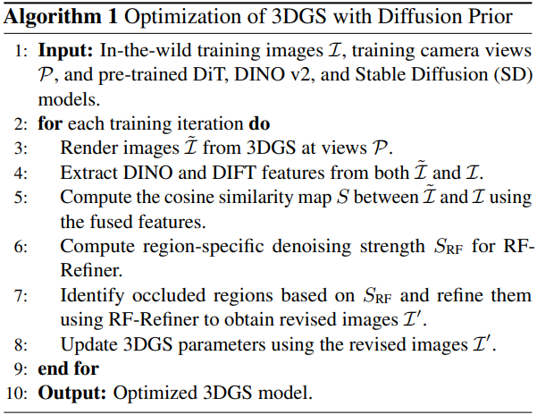 전체적인 최적화 과정은 Algorithm 1에 소개되어 있다. 먼저 현재 3DGS 모델로 이미지를 렌더링한다. 그런 다음, 렌더링된 이미지와 GT 이미지 모두에서 DINOv2 feature와 DIFT feature를 추출한다. Cosine similarity map을 계산하여 가려진 영역을 식별하고, RF-Refiner를 사용하여 해당 영역을 개선한다. 개선된 이미지는 3DGS 파라미터 업데이트를 위한 supervision으로 사용된다. 최적화 loss function은 기존 3DGS와 동일하다.