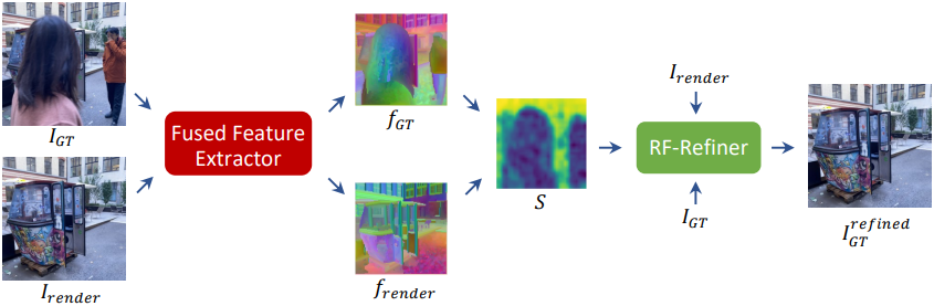 저자들은 보이는 내용을 보존하면서 가려진 영역을 복원하기 위해, similarity 기반 denoising 스케줄에 따라 작동하는 rectified flow 기반 방법인 RF-Refiner를 도입하였다. 구체적으로, RF-Refiner는 cosine similarity map을 기반으로 생성 편집 강도를 조절한다. similarity가 높은 영역은 변경되지 않고, similarity가 낮은 영역은 더 강하게 정제를 받는다. RF-Refiner와 융합된 cosine similarity map은 동시에 협력하여 3DGS 모델의 파라미터를 최적화한다.