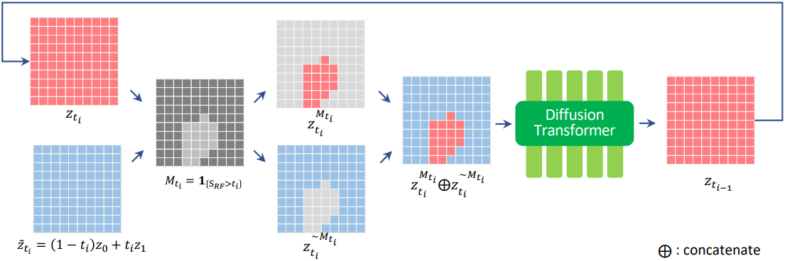 FLUX 모델은 \(t_i = s_\textrm{max}\)에서 시작하여 latent \(z_{t_i}\)를 반복적으로 denoising하여 $t_i = 0$까지 낮춘다. 이 과정에서 noise level이 다른 영역들을 동시에 처리하여 적응형 개선을 가능하게 한다.