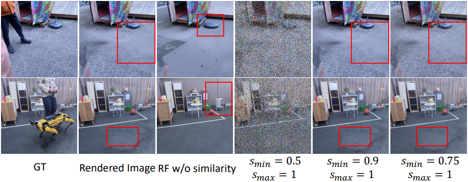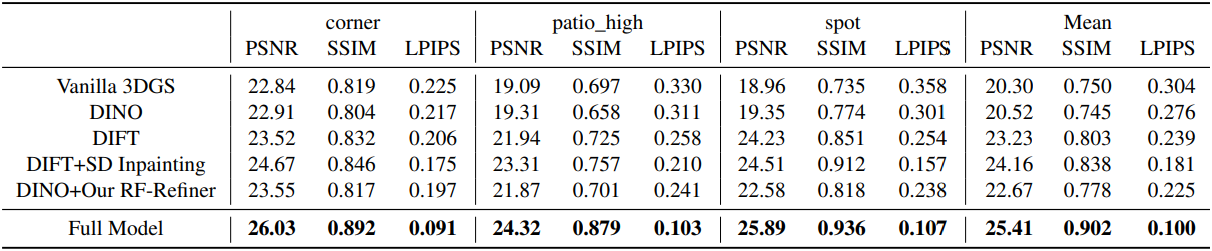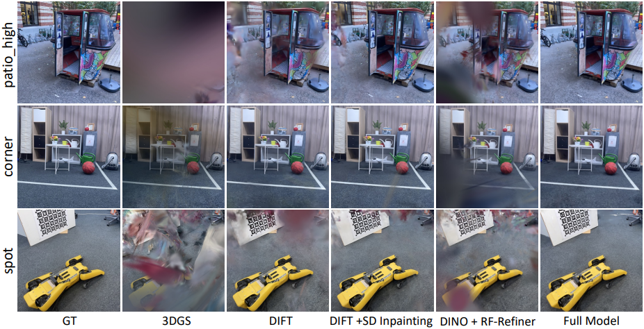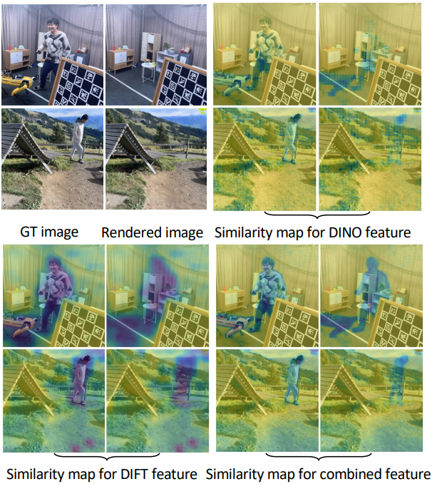 \[\begin{aligned} f_\textrm{render}^\textrm{dino} = \phi_\textrm{dino} (I_\textrm{render}), \quad f_\textrm{render}^\textrm{dift} = \phi_\textrm{dift} (I_\textrm{render}) \\ f_\textrm{GT}^\textrm{dino} = \phi_\textrm{dino} (I_\textrm{GT}), \quad f_\textrm{GT}^\textrm{dift} = \phi_\textrm{dift} (I_\textrm{GT}) \end{aligned}\]그런 다음, 두 feature를 각각 독립적으로 정규화하여 scale과 분포를 일치시킨 후, 두 feature를 concat하여 distractor를 감지하기 위한 최종 feature를 생성한다. 학습 및 렌더링 이미지에 대한 최종 feature는 다음과 같다.