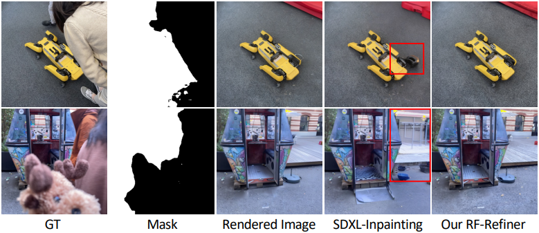 결정적으로, 가려진 영역을 직접 복원하면 해당 영역의 내용이 변경되어 기본 장면과의 일관성이 깨진다. 결과적으로, 복원된 이미지를 사용하여 3DGS를 최적화하면 불일치가 발생하여 재구성 품질이 저하된다.