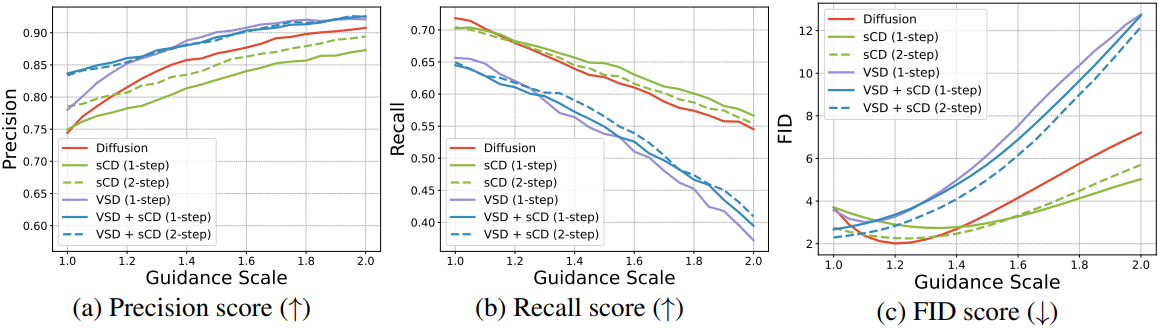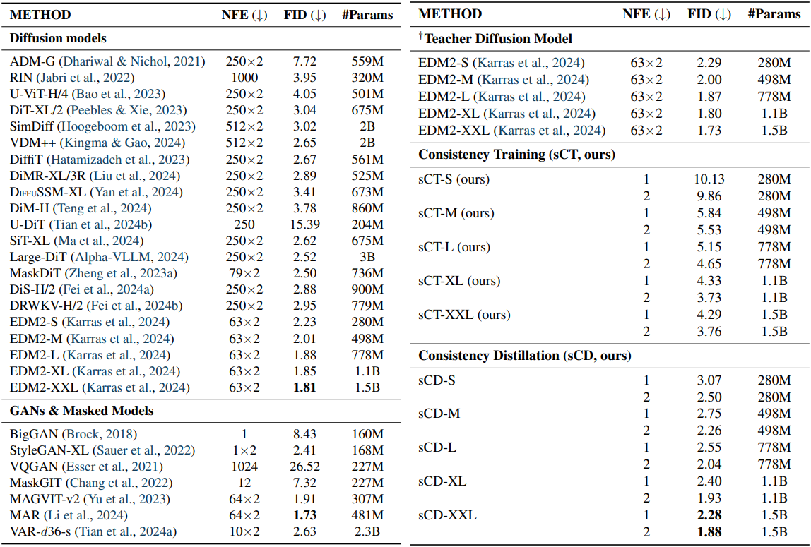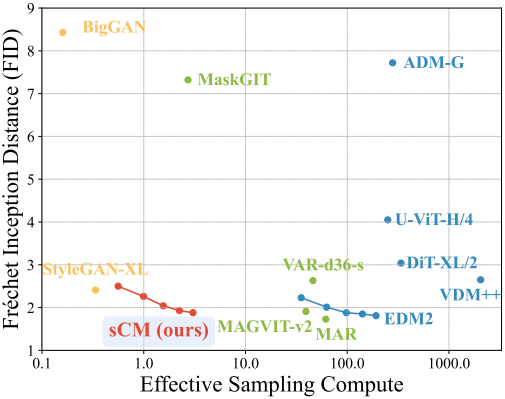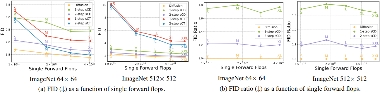이러한 개선을 통해 consistency training과 consistency distillation 모두에서 CM의 성능을 향상시켜 기존의 discrete-time CM과 비교했을 때 동등하거나 더 나은 결과를 달성했다. 본 논문의 모델인 sCM은 다양한 데이터셋과 모델 크기에서 성공적인 결과를 보여주었다. 저자들은 CIFAR-10, ImageNet 64$\times$64, ImageNet 512$\times$512에서 sCM을 학습시켜 1.5B 파라미터의 전례 없는 규모에 도달했으며, 이는 현재까지 학습된 CM 중 가장 큰 규모이다. sCM은 연산량 증가에 따라 효과적으로 scaling되어 예측 가능한 방식으로 더 나은 샘플 품질을 달성하였다. 또한, 훨씬 더 많은 샘플링 연산을 필요로 하는 SOTA diffusion model과 비교했을 때, sCM은 2-step 생성을 사용하여 FID 차이를 10% 이내로 줄였다.