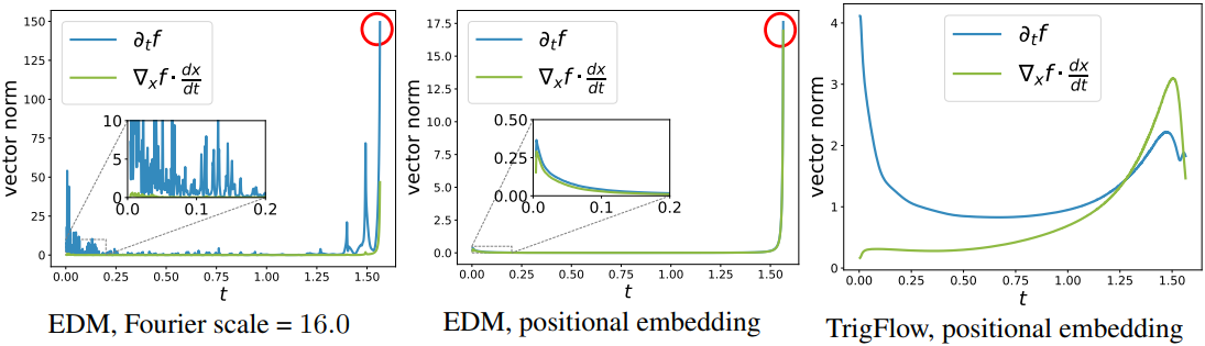 \[\begin{equation} \sin (t) \frac{\textrm{d} \textbf{F}_{\theta^{-}}}{\textrm{d} t} = \sin (t) \nabla \textbf{x}_t \textbf{F}_{\theta^{-}} \frac{\textrm{d} \textbf{x}_t}{\textrm{d} t} + \sin (t) \partial_t \textbf{F}_{\theta^{-}} \end{equation}\]이다. 또한 \(\nabla \textbf{x}_t \textbf{F}_{\theta^{-}} \frac{\textrm{d} \textbf{x}_t}{\textrm{d} t}\)는 일반적으로 안정적이므로 (well-conditioned), 불안정성 문제는 \(\sin (t) \partial_t \textbf{F}_{\theta^{-}}\)에서 발생한다. \(\sin (t) \partial_t \textbf{F}_{\theta^{-}}\)는 다음과 같이 분해된다.