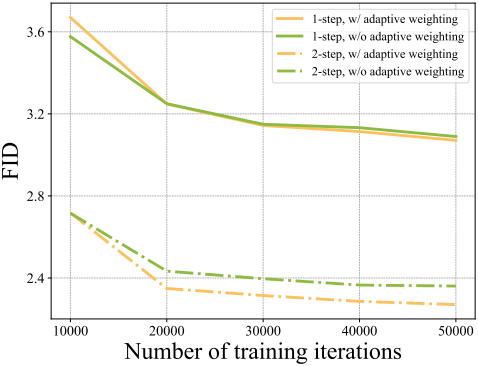 저자들은 EDM2를 따라, CM과 함께 adaptive weighting function을 학습시키는 것을 제안하였다. 이는 hyperparameter 튜닝의 부담을 덜어줄 뿐만 아니라 더 나은 성능과 무시할 수 있는 학습 오버헤드로 수동으로 설계된 weighting function을 능가한다.