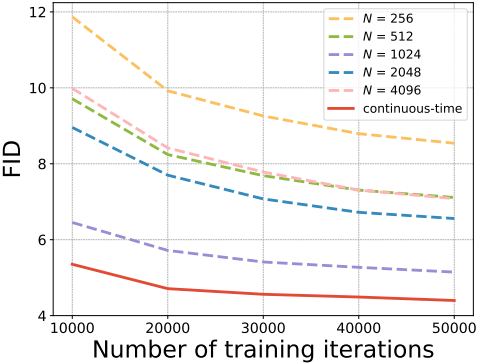 아래는 모든 테크닉을 통합하여 학습시킨 continuous-time CM의 성능을 discrete-time CM과 비교한 그래프이다.