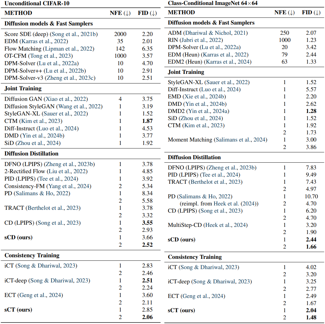 다음은 CIFAR-10과 ImageNet 64$\times$64에서의 성능을 비교한 표이다.
