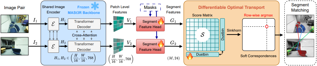 저자들은 패치 레벨의 임베딩을 segment 레벨의 descriptor로 변환하는 가벼운 segment-feature head를 추가하여 segment matching에 MASt3R를 적용했다. 이미지 쌍이 주어지면, 이러한 descriptor들을 매칭하여 segment correspondence를 구축한다. Head는 SuperGlue를 따르는 contrastive objective를 사용하여 학습된다.