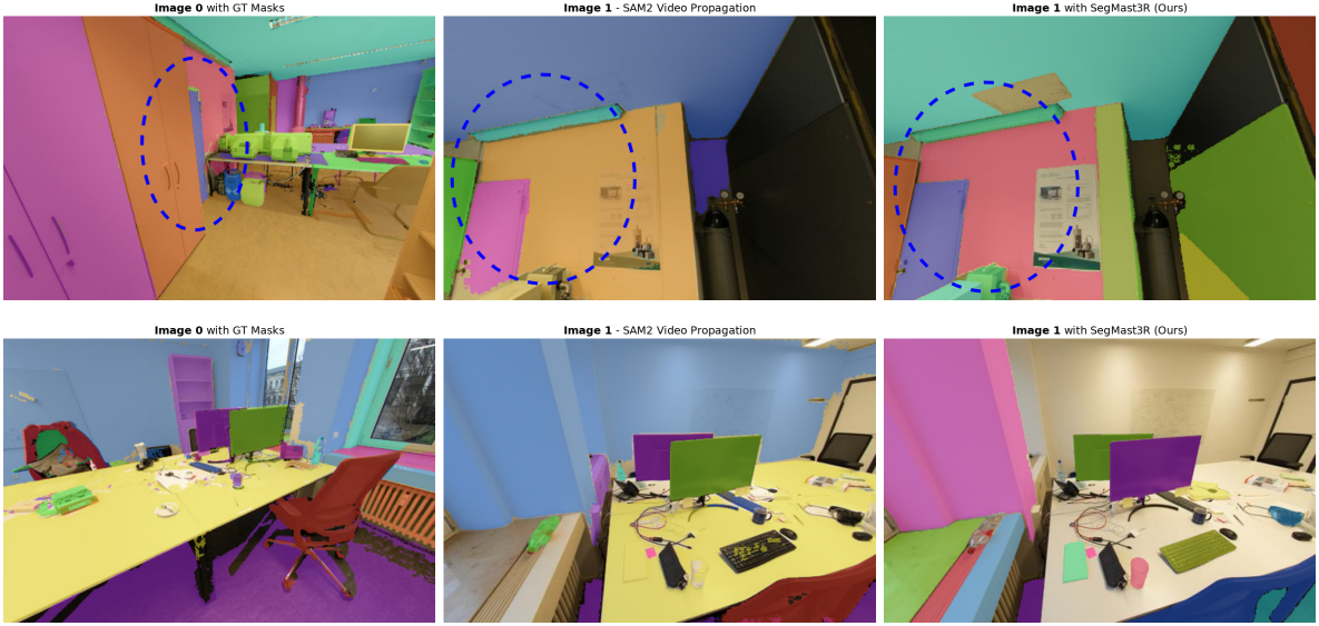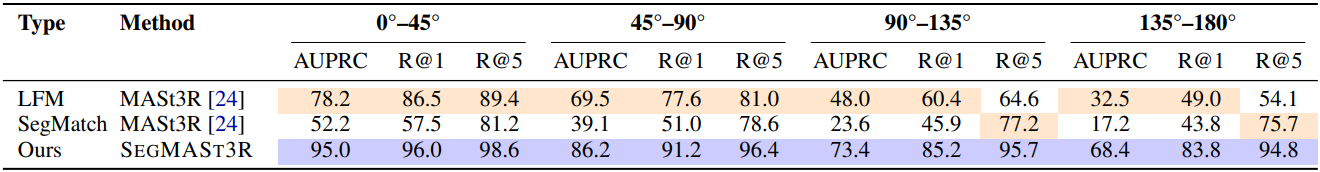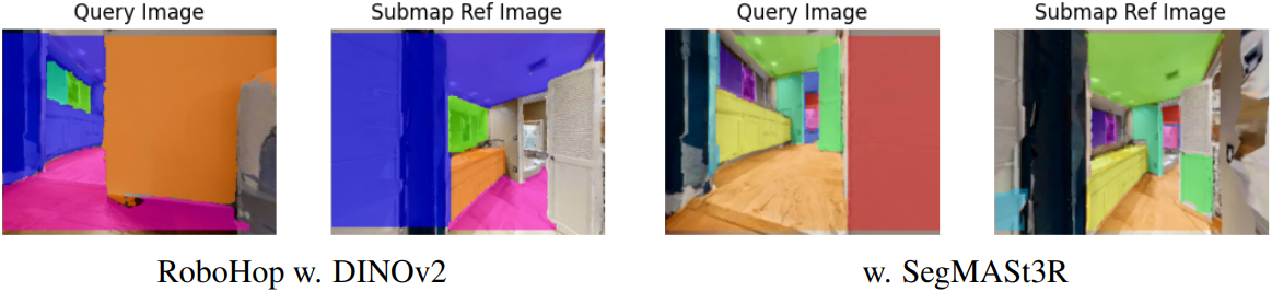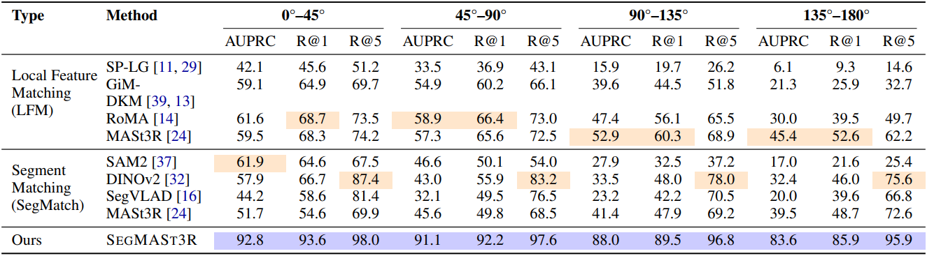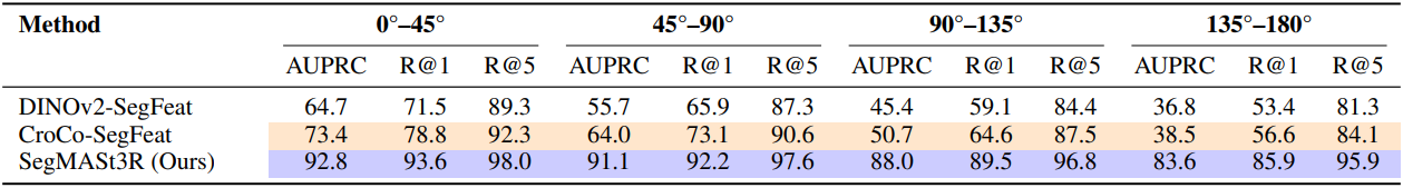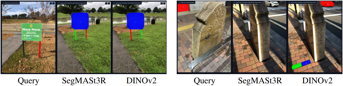 Segment matching은 baseline이 넓은 경우에 급격히 저하된다. 이는 동일한 장면의 이미지가 크게 분리된 시점에서 촬영되어 원근감, 크기, 그리고 최대 180° 회전 변화가 발생하는 경우이다. DINOv2 또는 ViT와 같은 사전 학습된 인코더의 feature에 의존하는 기존 접근 방식은 반복적인 패턴을 불일치시키거나 동일한 물체에 대한 매우 다른 시점을 연결하지 못하는 경우가 많다.