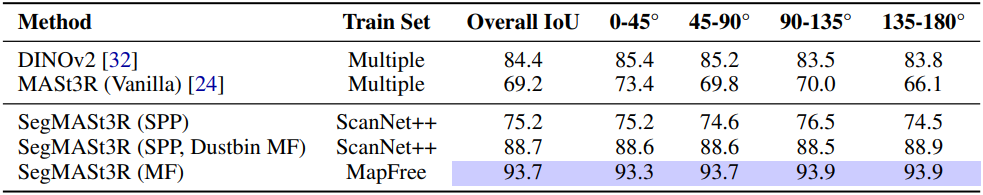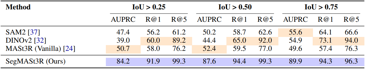 본 논문의 모델인 SegMASt3R는 훨씬 더 큰 데이터셋과 SOTA local feature matching 방법을 사용하여 학습된 SAM2의 video propagator를 포함한 강력한 모델들을 능가하는 것으로 나타났다.