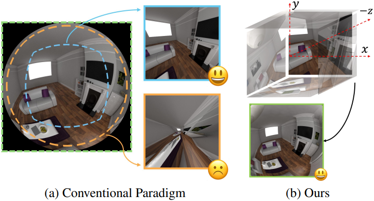 리샘플링 단계는 hybrid distortion field와 함께 간단한 좌표 변환만을 포함한다. 공유 카메라 중심에서 각 평면까지의 거리는 1로 정규화된다. 예를 들어, 90° FOV 외부의 픽셀 $(x, y)$을 렌더링하려면 ($x > 1$, $\vert y \vert < 1$), 오른쪽 면의 픽셀은 오른쪽을 바라보는 카메라 좌표계에서 $(-\frac{1}{x}, \frac{y}{x})$로 얻을 수 있다. 렌즈 왜곡 \((x^\prime, y^\prime) = \mathcal{D}_\theta (x, y)\)을 고려하면, 오른쪽 면의 조회 위치가 $(-\frac{1}{x^\prime}, \frac{y^\prime}{x^\prime})$으로 변경된다. 이렇게 전체 distortion field를 cubemap에 직접 적용하여 넓은 FOV 렌더링을 수행할 수 있다.