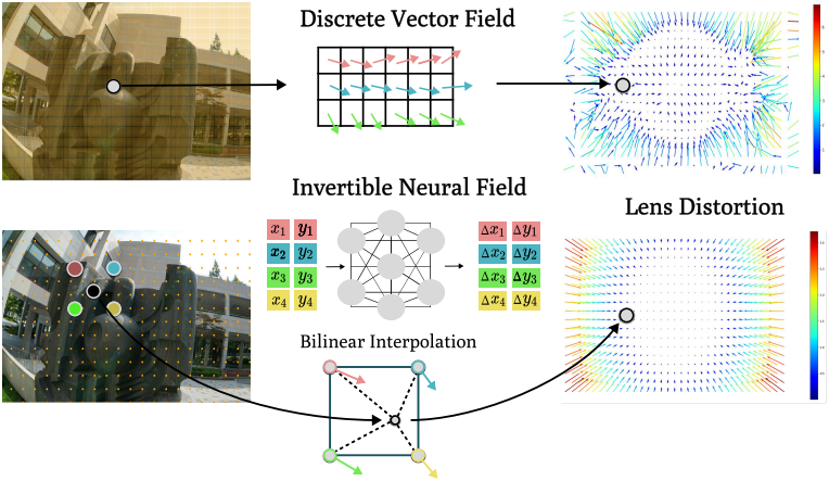 렌즈 모델링을 개선하기 위해, 신경망을 사용하는 기존의 distortion 모델을 표현력과 계산 효율성의 균형을 맞춘 새로운 하이브리드 신경망 모델로 대체했다. 본 논문의 방법은 invertible ResNet을 사용하여 정규화된 sparse 그리드에서 변위를 예측한 후, bilinear interpolation을 통해 연속적인 distortion field를 생성한다.