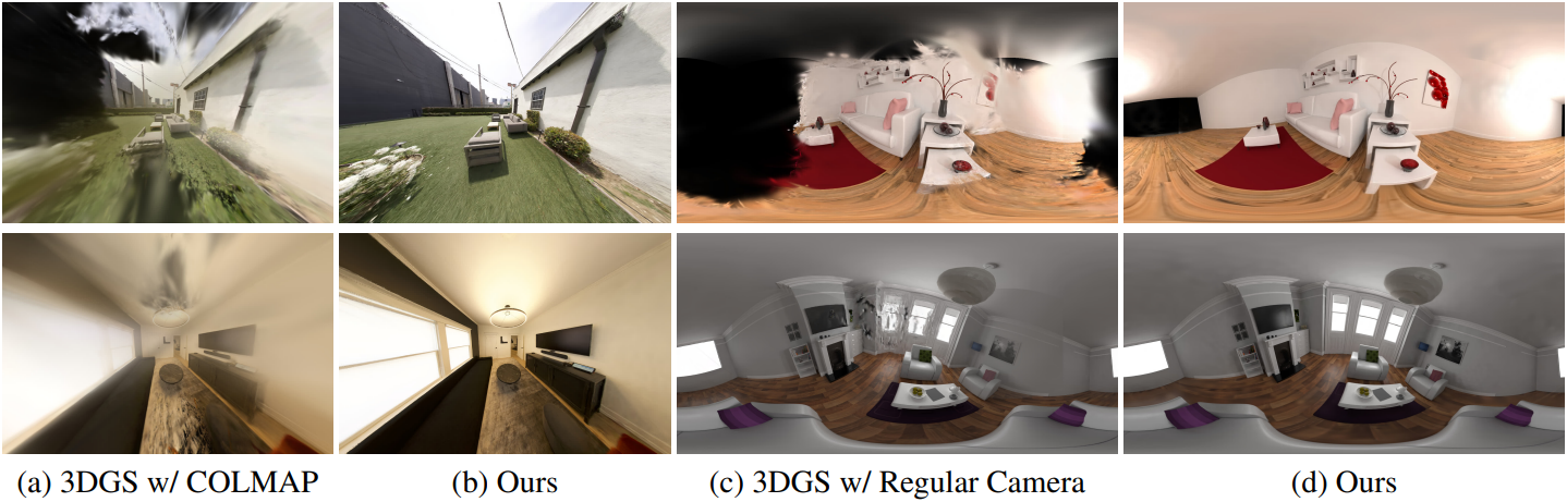본 논문에서는 렌즈 왜곡, 카메라 intrinsic, 카메라 포즈, 장면 표현을 3D Gaussian을 이용하여 동시에 최적화하는 미분 가능한 rasterization 파이프라인인 Self-Calibrating Gaussian Splatting을 소개한다. 본 접근 방식은 리샘플링, 사전 calibration, 다항식 distortion 모델 없이도 넓은 FOV의 이미지에서 고품질 재구성을 달성하였다.