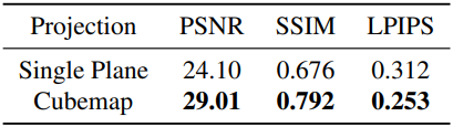 다음은 (왼쪽) hybrid distortion field와 (오른쪽) cubemap에 대한 ablation 결과이다.