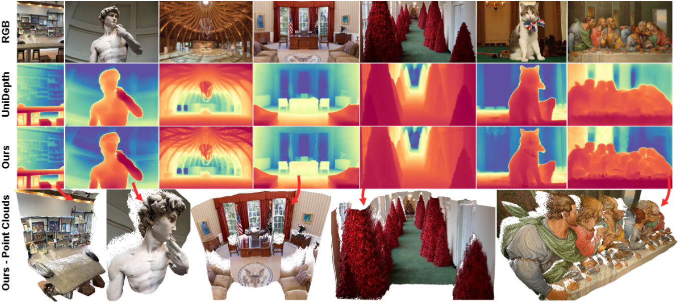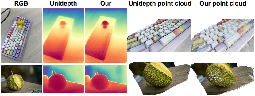 다음은 실제 이미지에 대한 깊이 추정 결과를 unprojection하여 얻은 포인트 클라우드를 비교한 예시이다.