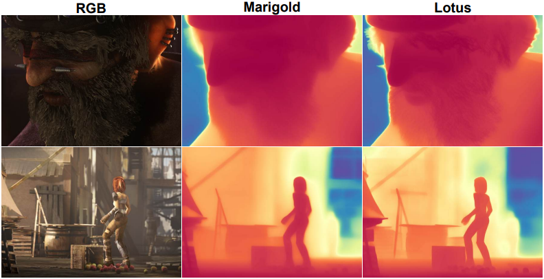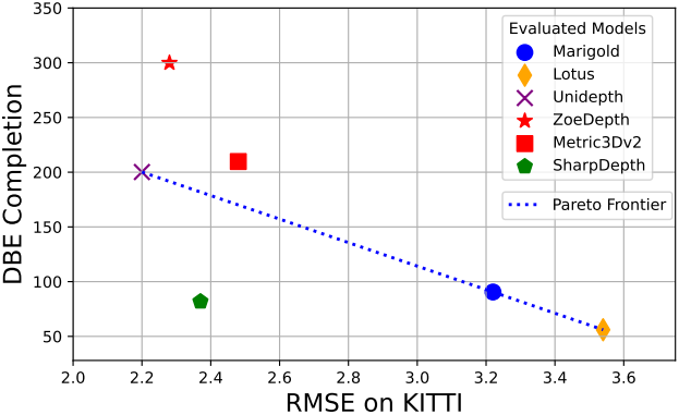 최근 여러 생성적 깊이 추정 모델들은 diffusion 기반 text-to-image 모델을 활용하여 높은 공간적 세부 묘사와 선명한 경계를 가진 depth map을 생성한다. 이러한 개선은 대규모 text-to-image 모델에서 물려받은 풍부한 이미지 prior에 기인한다. 그러나 latent diffusion model에 내재된 한계로 인해 이러한 깊이 모델의 fine-tuning은 dense depth map을 사용할 수 있는 합성 데이터에서만 가능하며, 실제 이미지에 적용할 경우 도메인 갭이 발생한다. 또한 이러한 모델들은 정확한 metric depth가 아닌 affine-invariant depth만 제공한다.