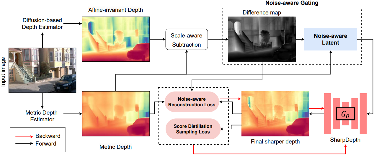 Diffusion model의 forward process에 단순하게 의존하는 대신, 불확실한 영역에서 sharpening 모델 \(\textbf{G}_\theta\)에 명시적인 guidance를 제공하는 Noise-aware Gating 메커니즘을 도입하였다. GT에 구애받지 않는 fine-tuning을 위해, 사전 학습된 $f_G$에서 SDS loss를 사용하여 세밀한 디테일을 추출하고, Noise-aware Reconstruction loss를 사용하여 정확한 metric 예측을 보장한다.