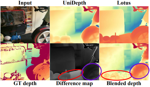 구체적으로, metric depth 추정 모델로 UniDepth를, diffusion 기반 깊이 추정 모델로 Lotus를 사용한다. UniDepth는 Lotus 보다 선명한 디테일이 부족하지만 상당히 정확한 깊이 예측을 제공한다. 위 그림에서 볼 수 있듯이, 먼저 이러한 예측을 정규화한 다음 두 개의 depth map 간의 difference map을 계산한다. Difference map에서 더 밝은 영역은 상당한 불일치가 있는 영역을 강조하여 추가 디테일이 필요한 영역을 나타낸다. 반대로, 어두운 영역은 두 깊이 추정 모델 간에 상호 동의가 있는 영역을 나타낸다. 이러한 영역도 깊이 개선의 이점을 얻을 수 있지만, 선명화 과정에서는 우선순위가 낮다.