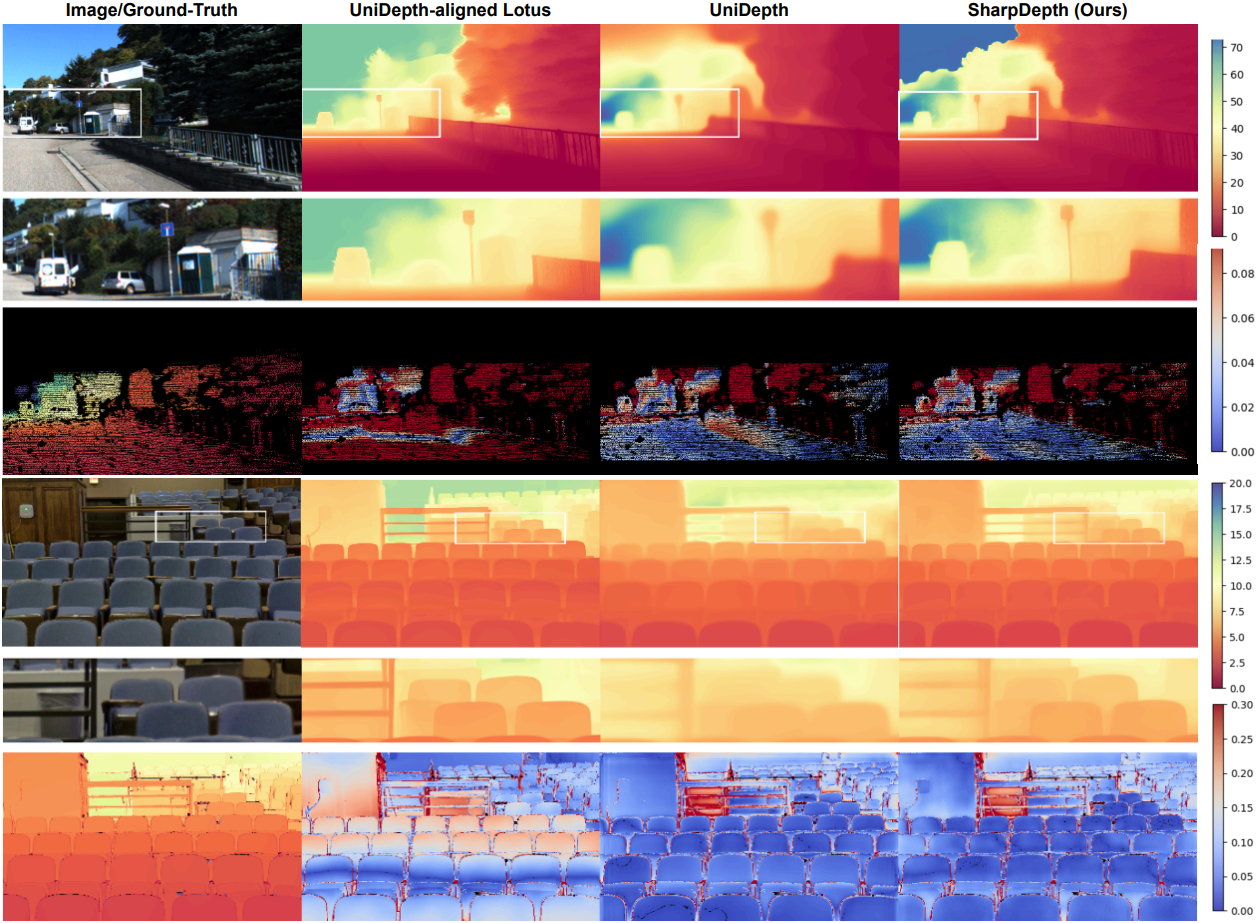 본 논문에서는 고주파 디테일을 포함하는 정확한 zero-shot metric depth를 생성하도록 설계된 diffusion 기반 모델인 SharpDepth를 소개한다. Affine-invariant depth estimator를 기반으로 하는 본 방법은 기존 metric depth 모델의 초기 예측을 개선하여 정확한 metric 예측을 유지하면서 깊이 디테일을 향상시킨다. 이를 위해, affine-invariant 모델과 metric depth 모델의 깊이 예측값을 공통 스케일로 정규화하여 일치도를 측정하고, difference map을 생성한다. 이러한 difference map을 통해 신뢰할 수 있는 깊이 예측을 보이는 이미지 영역뿐만 아니라, 추가적인 선명화 및 세부화가 필요한 영역도 식별할 수 있다.