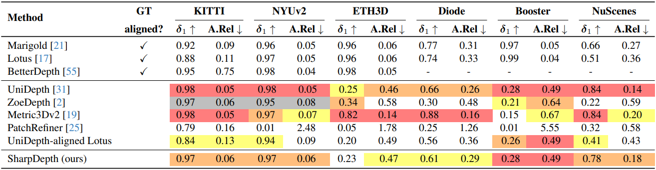 이러한 테크닉을 통해 SharpDepth는 다양한 장면에서 정확하고 높은 디테일의 metric depth 추정을 제공할 수 있다. 위의 학습 loss의 또 다른 이점은 학습을 위한 추가적인 GT 없이 사전 학습된 깊이 모델만을 사용하여 실제 데이터에 대한 개선을 학습시킬 수 있다는 것이다.
