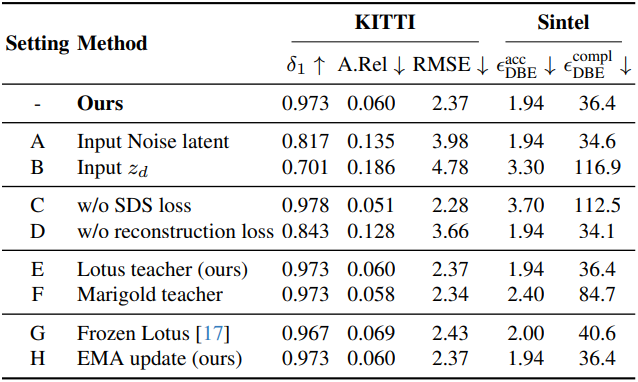 이 혼합된 latent $z_d^\prime$은 두 깊이 예측 간의 차이가 큰 영역과 작은 영역을 효과적으로 구분하여 선명도 향상을 위한 강력한 prior 역할을 한다. 이러한 영역을 분리함으로써 최적화 프로세스는 차이가 적은 영역의 수정을 최소화하면서 차이가 큰 영역에 집중하여 선명도가 유지되는 동시에 디테일을 세밀하게 재구성할 수 있다.