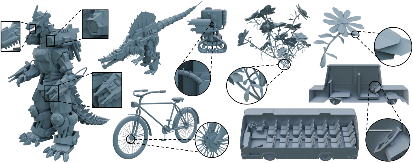 SparseFlex의 sparse voxel 구조에도 불구하고, 고해상도에서 전체 표현을 직접 렌더링하는 것은 계산적으로 비쌀 수 있다. 또한, 표준 렌더링 loss는 일반적으로 보이는 표면에만 초점을 맞추고 형상의 내부는 무시한다. 게다가, 메쉬에서 렌더링 loss에 의존하는 최근 방법들은 일반적으로 전체 메쉬를 추출해야 하는데, 이는 dense한 표현이 부분 추출을 쉽게 허용하지 않기 때문이다. 이와 대조적으로, 본 논문에서 제안하는 sparse 표현은 자연스럽게 부분 추출을 가능하게 한다.