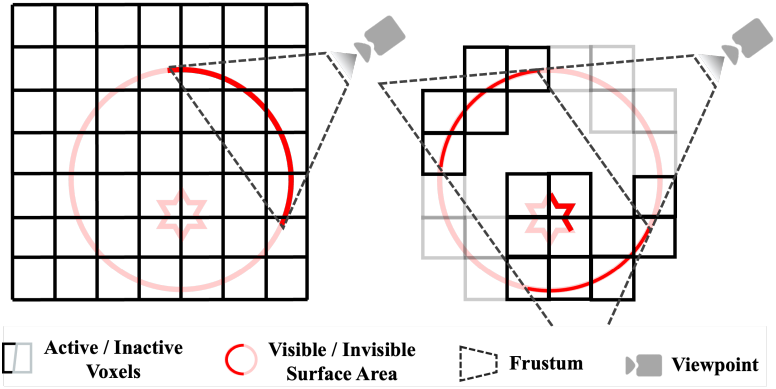 이러한 문제를 해결하기 위해, 본 논문에서는 frustum-aware sectional voxel training을 도입하였다. 구체적으로, 각 학습 iteration 동안 카메라의 viewing frustum 내에 있는 voxel만 활성화한다. Voxel을 활성화한다는 것은 isosurface 추출 및 렌더링 프로세스에 voxel을 포함하는 것을 의미한다. “Sectional”은 한 번에 3D 공간의 일부만 처리하여 메모리 사용량을 크게 줄인다는 것을 의미한다.